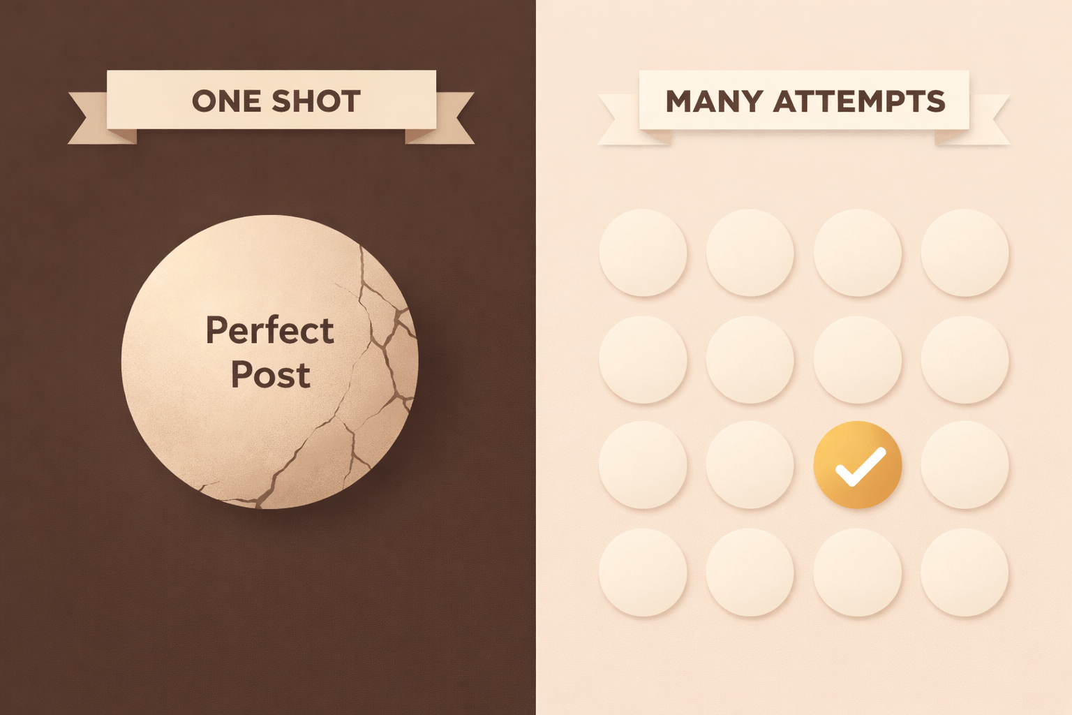 The biggest hurdle for many brand owners is shifting the perspective from perfectionist to iterative testing. You’re likely coming from the service and product development where perfectionism and success at launch is a huge priority. However, marketing and especially social media marketing relies on volume and iterations. We need you to shift gears from trying to get the best possible result to “how can I get used to doing this as frequently as possible”. Don’t aim for perfection - aim for volume of repetition. This will take longer than you may think, and often requires long term commitment, sometimes embarrassment, and thick skin.